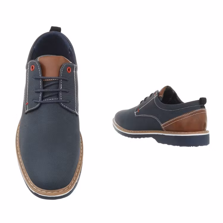 En marinblå snörsko i skinnimitation och med snygga bruna detaljer. Slitsula och klack i hårt gummi. Passar både till arbete och fritid.