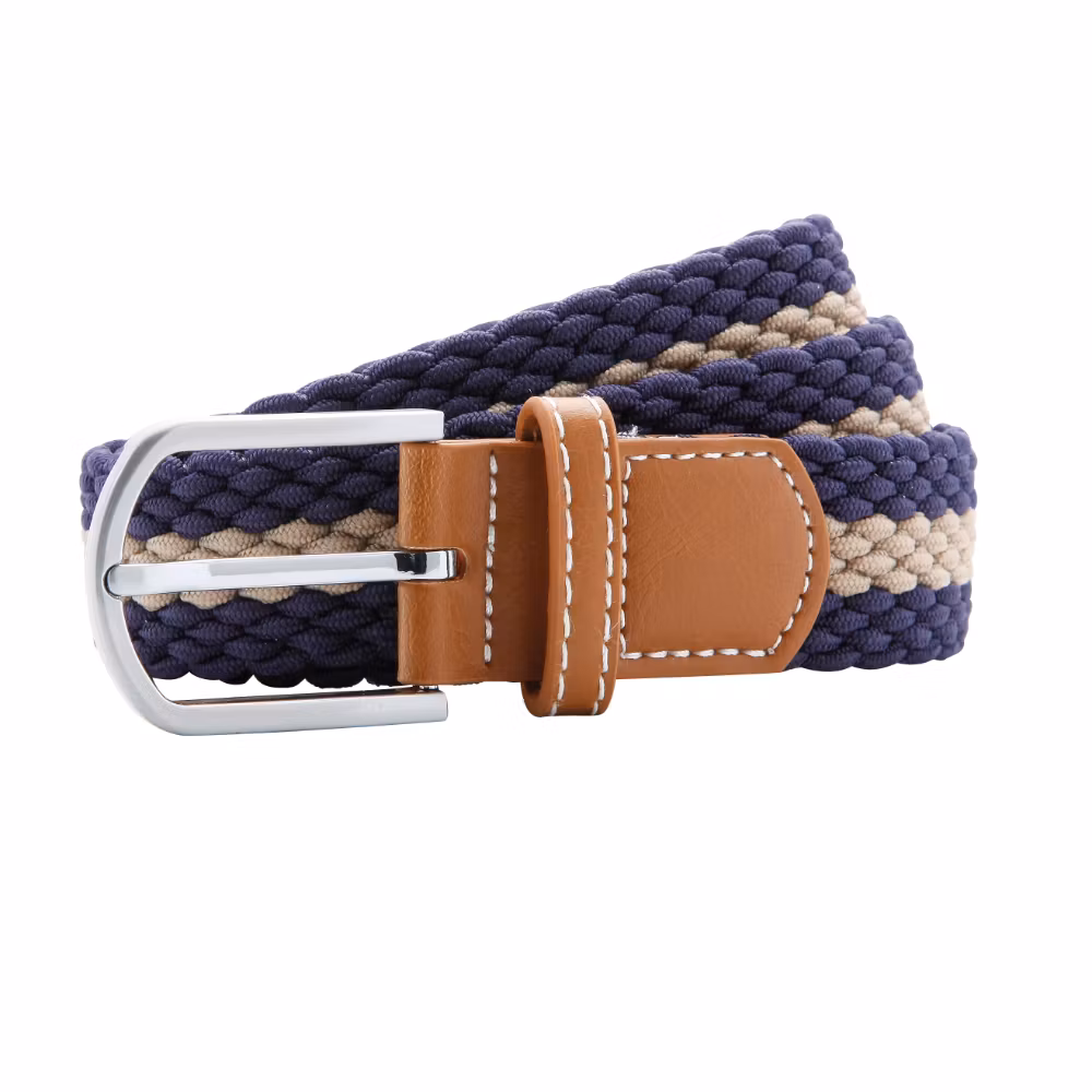 Beige blå flätat bälte i gummi från Asquith&Fox med trendigt zick-zack mönster. Spänne i krom och läder detaljer. Flätningen gör det möjligt att spänna bältet mer anpassningsbart.