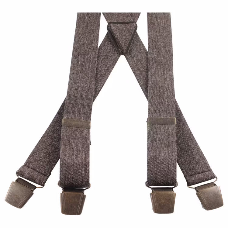 Läckra kvalitetshängslen från Portia med mörka clip-on spännen. Två spännen framtill och två baktill vid ryggen. Levereras i en presentbox. Portia´s hängslen tillverkas förhand i deras fabrik i Malmö.