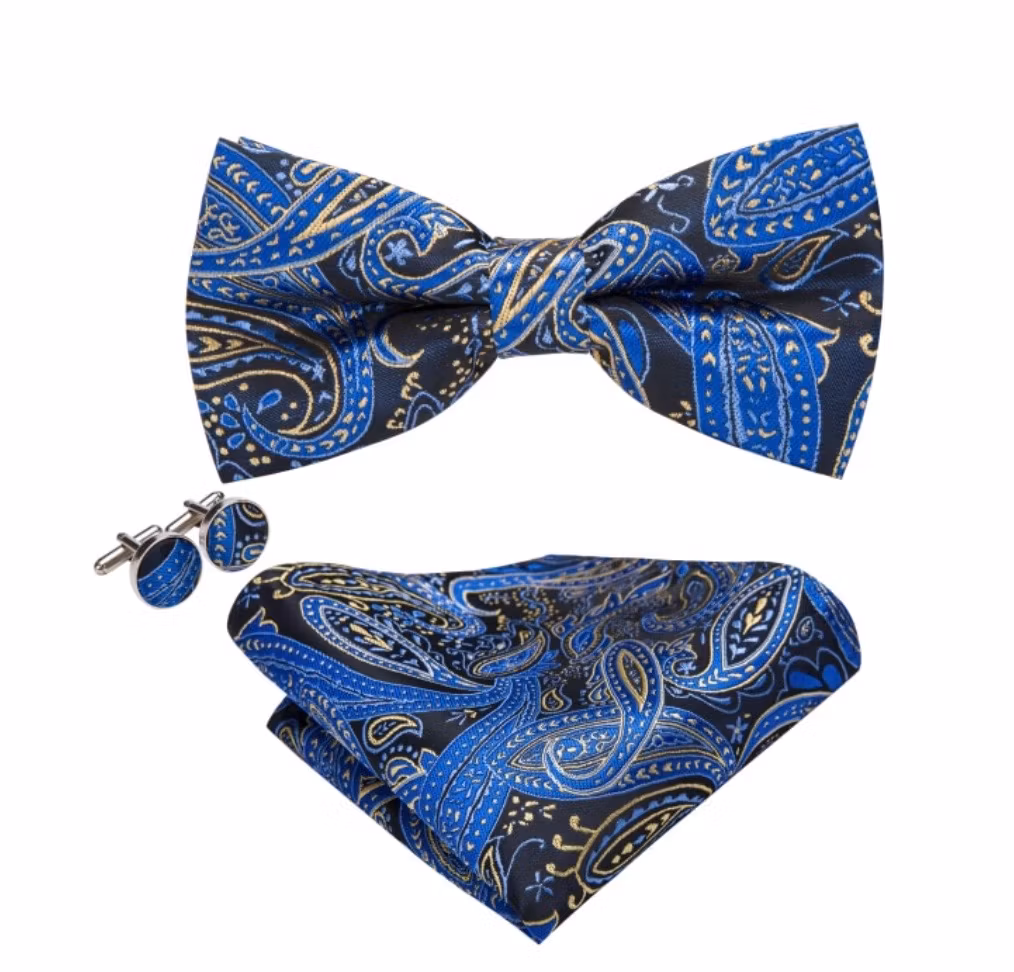 Finns i lager för omgående leverans! Paisley mönstrad fluga, manschettknappar, bröstnäsduk 299 kr 224 kr Lägg i varukorgen Artikelnummer: 904393 Leverantör: Paket innehållande färdigknuten, justerbar fluga, två manschettknappar samt en bröstnäsduk.Storlek: Fluga 6x12cm • Bröstnäsduk 23x24cm.Material: Silk.