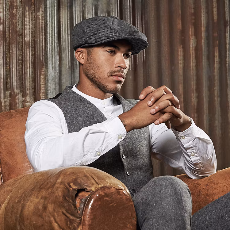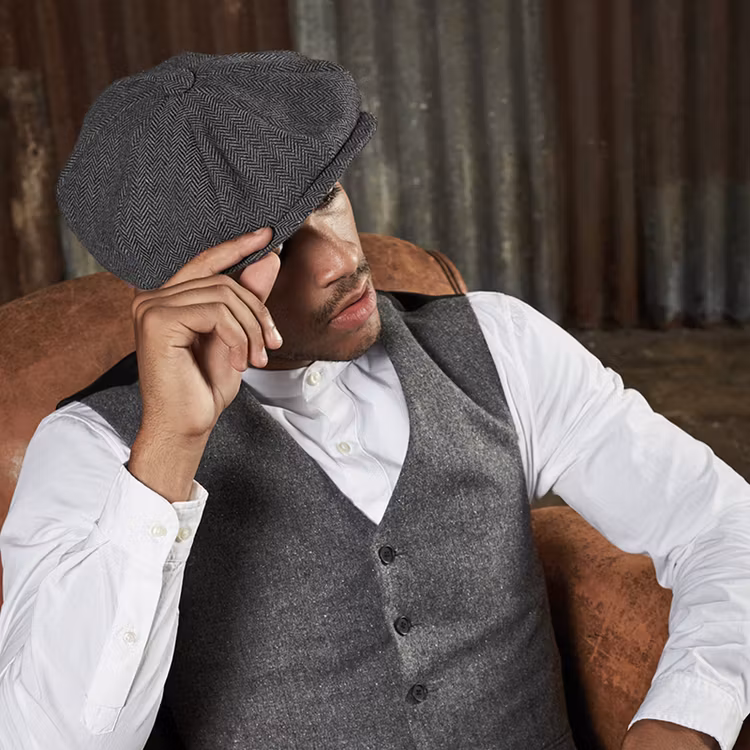Tunn och skön grå keps från Beechfield i Bakerboy modell med klassiskt fiskbensmönstrat tyg.