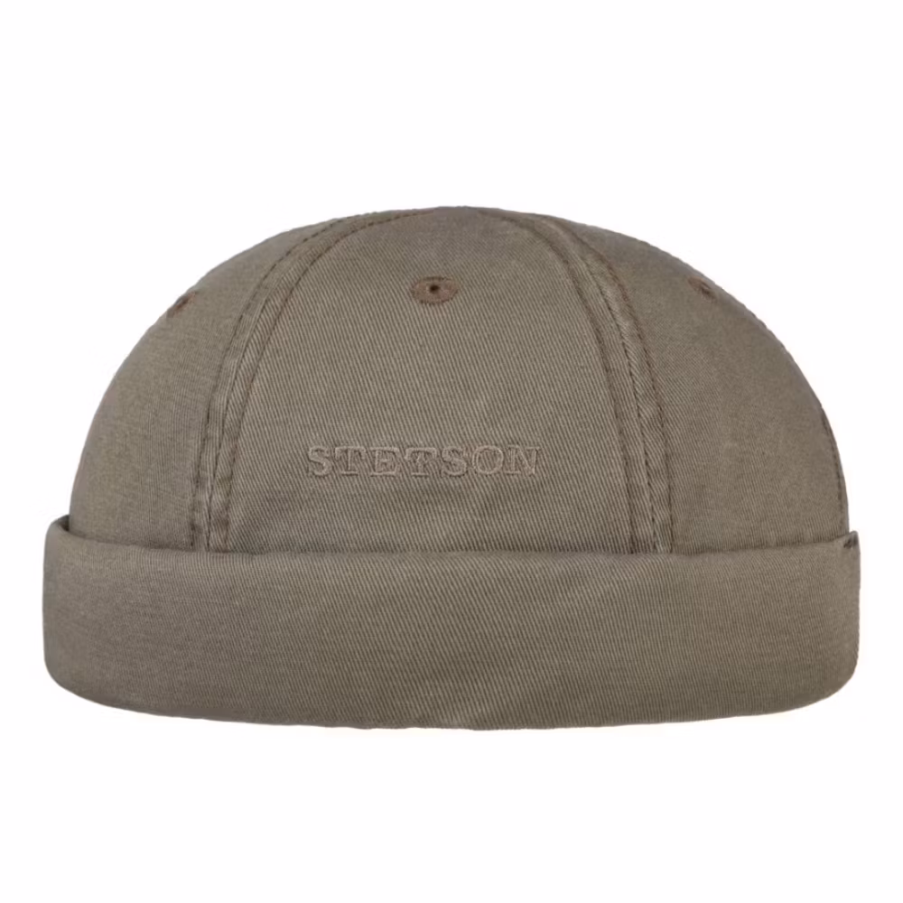 Grå Docker (sotarmössa) från Stetson i mjuk 100% tvättad bomull och vikbar kant. Storlek kan justeras med kardborre på baksidan.