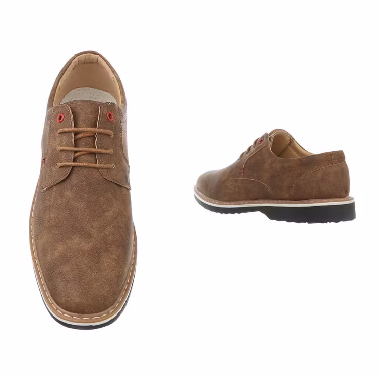 En stilren brun snörsko i brun skinnimitation med en slät och slitstark ovansida. Slitsula och klack i svart gummi. Passar både till arbete och fritid.