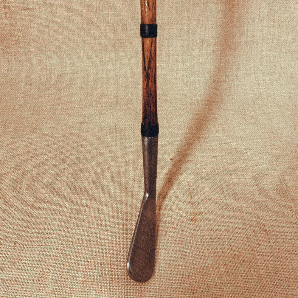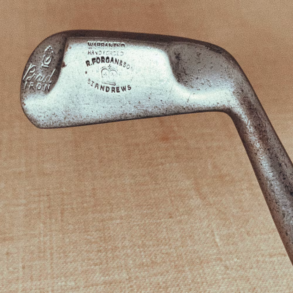 En spelklar järnklubba. Klubbhuvudet är stämplad R. Forgan & Son St. Andrews - Braid Iron samt har Forgan Crown cleek mark tillsammans med Nicoll Hand cleek mark. Line face. Mockagrepp.