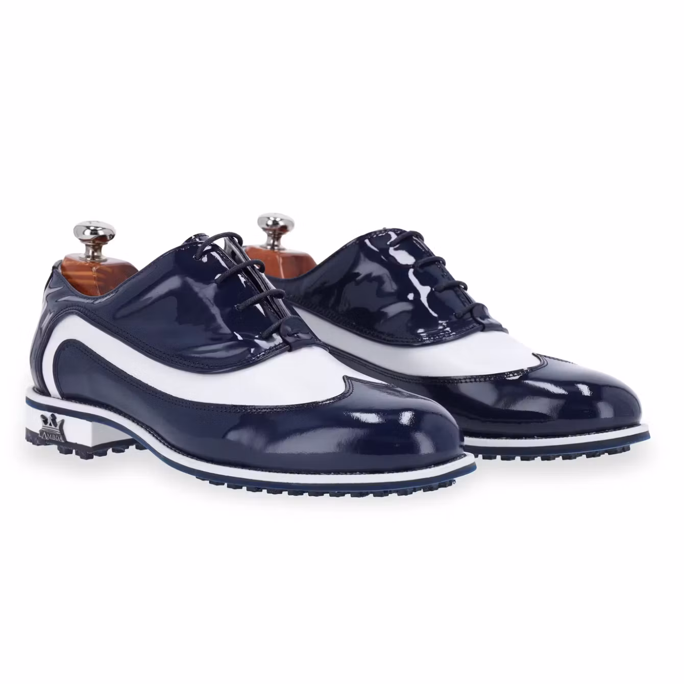 Lambda´s Catania White & Navy är en klassisk handgjord golfsko från Portugal.