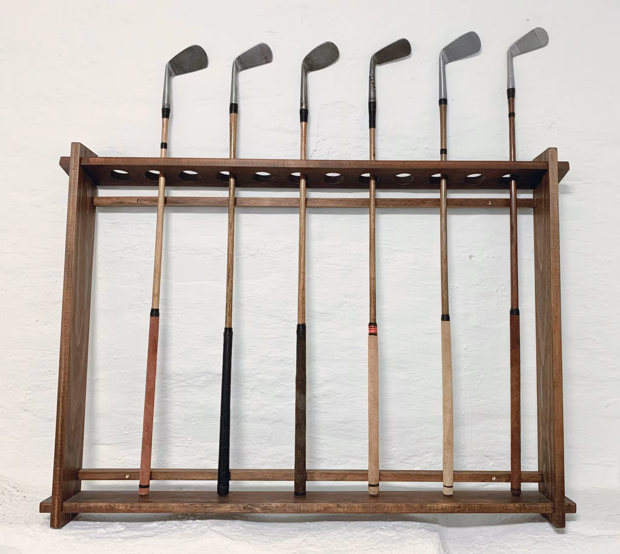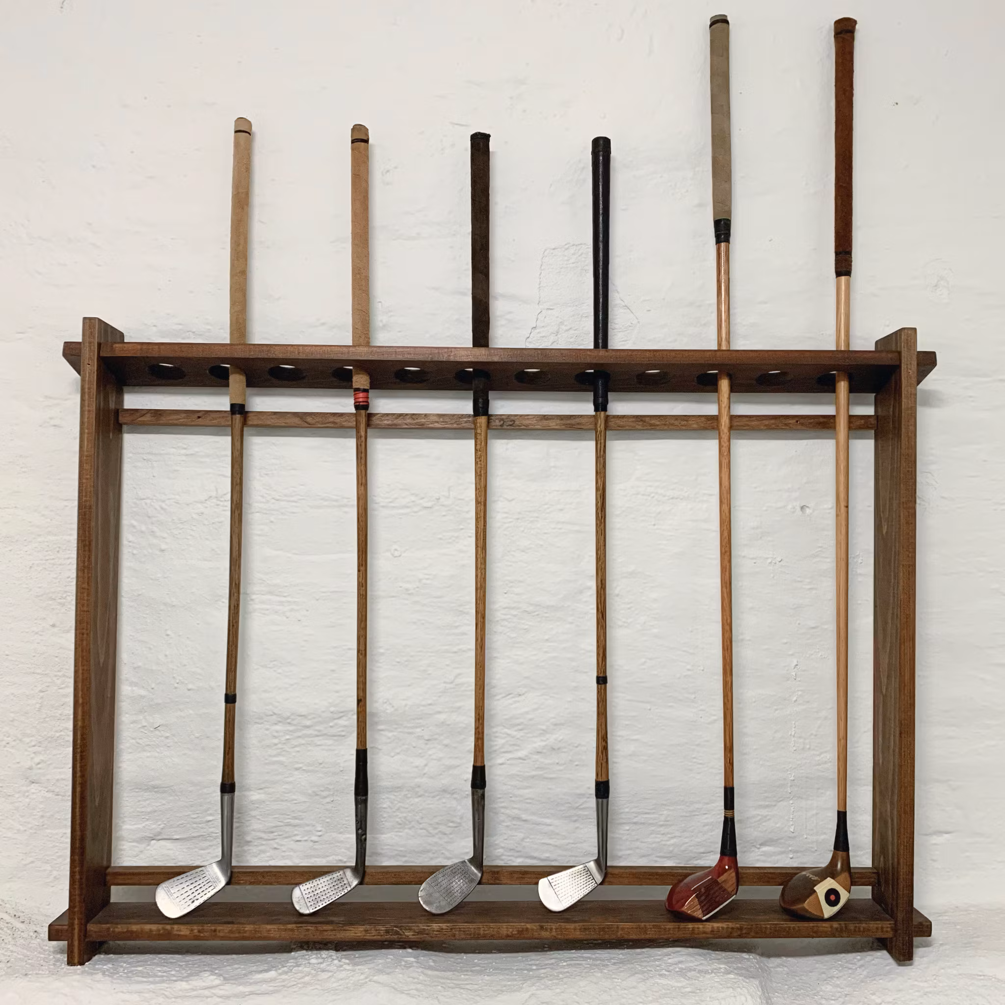Detta är ett större klubbställ i trä för att sätta på väggen. Kommer omonterat och monteringsanvisning medföljer. Måttet är ca 108x77cm och det får plats 12 klubbor.