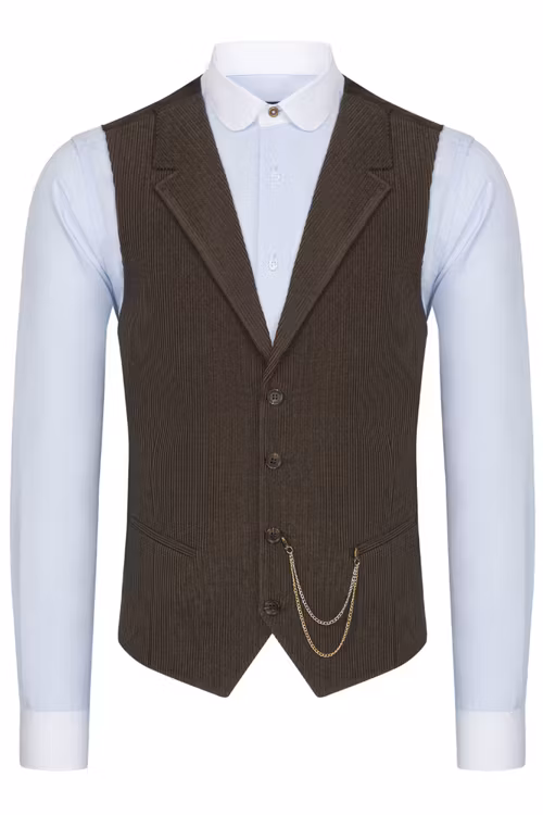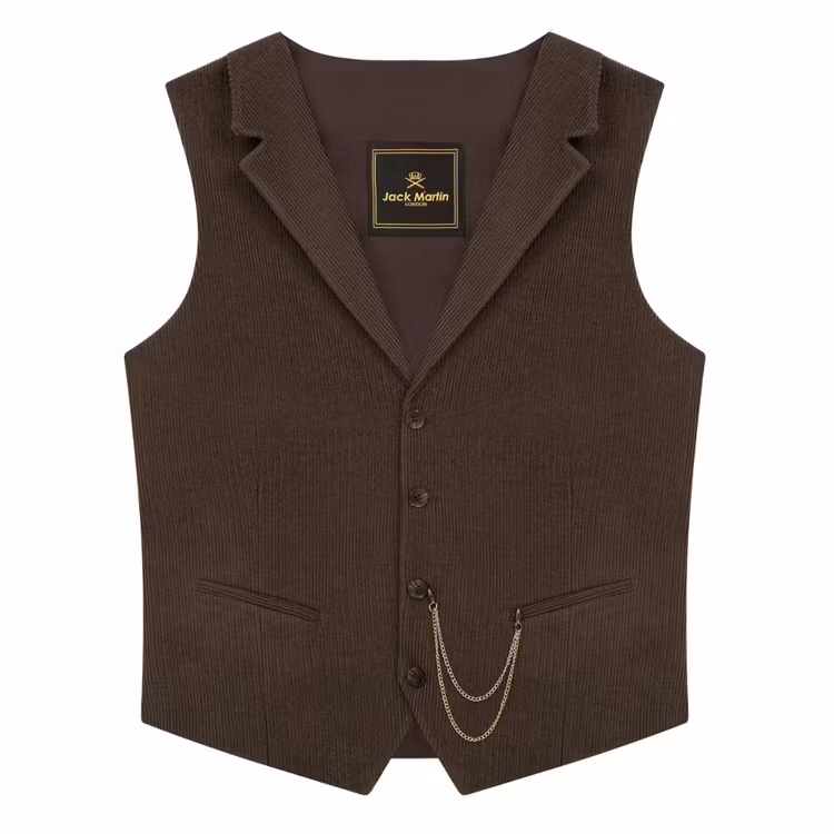 En elegant brun väst i manchester som passar både till arbetet eller på fritiden. Enkelknäppt Semi-Slim modell med fyra bruna knappar och två mindre fickor. Brunt bakstycke.