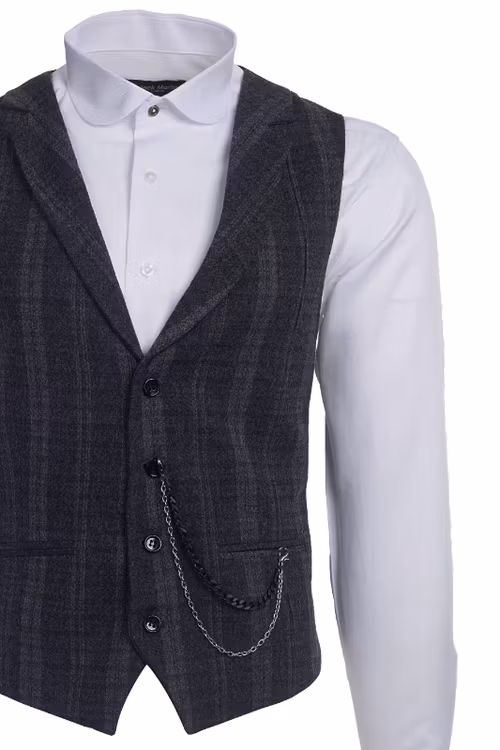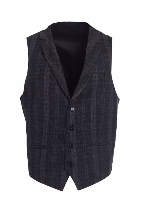 En snygg gråsvart ullväst som passar både till arbetet eller på fritiden. Enkelknäppt Semi-Slim modell med fyra svarta knappar och två mindre fickor. Svart bakstycke.