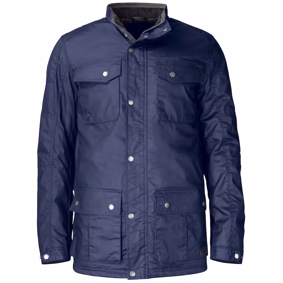 Denna jacka från Cutter & Buck är framtagen i ett belagt bomullstyg och är med sin matta finish det perfekta plagget i vardagen som skyddar som lätt regn och smuts. Diamantformad kviltad insida på jackan. Fyra fickor framtill som är sydda med precision samt en innerficka att lägga plånbok eller mobil i. Jämfört med skinn eller vaxerade jacktyger kan det här plagget med sin gummiliknande beläggning tåla vanlig maskintvätt. Herrjackan är anpassad i längd för att täcka en kavaj. Darrington är en modern bikerinspirerad jacka med metallknappar och YKK metalldragkedja.