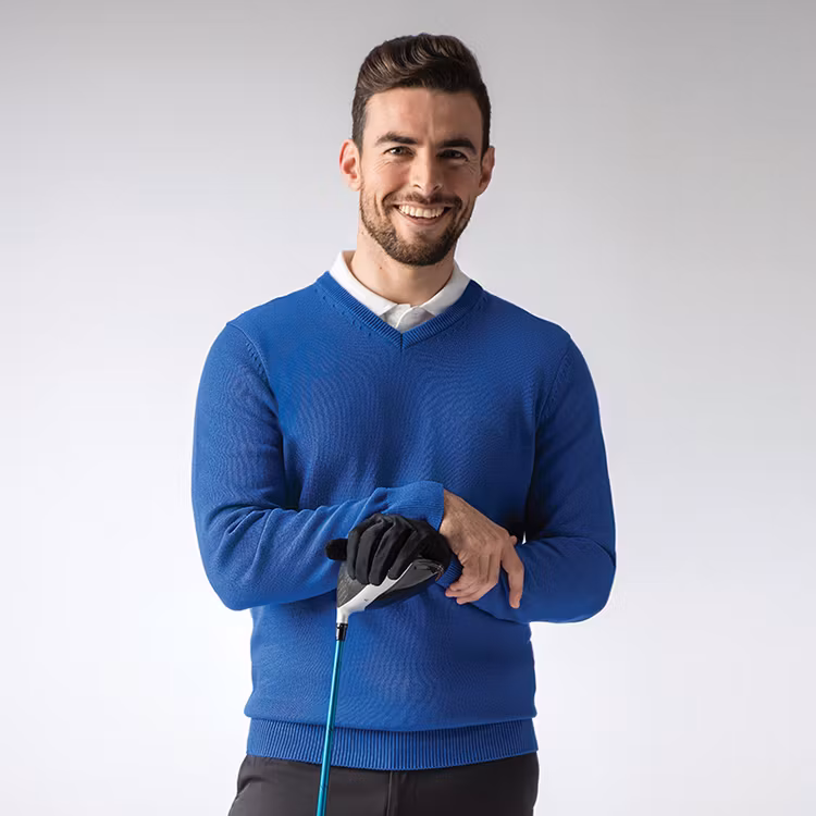 Finns i lager för omgående leverans! Glenmuir V-neck pullover 959 kr @Storlek M (40/42 XL (46/48 L (42/44 Lägg i varukorgen Artikelnummer: 903066 Leverantör: Glenmuir Stickad V-halsad herrtröja från Glenmuir i bomull med en liten blandning av cashmere. Ribstickad nedtill och i ärmslut.Material: 95% bomull och 5% cashmereFärg: Ascot blå