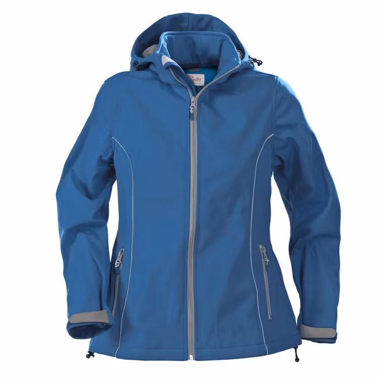 Softshelljacka i dammodell med avtagbar huva. Dragsko nedtill och på huvan.Reflekterande piping på framsida och på huva.