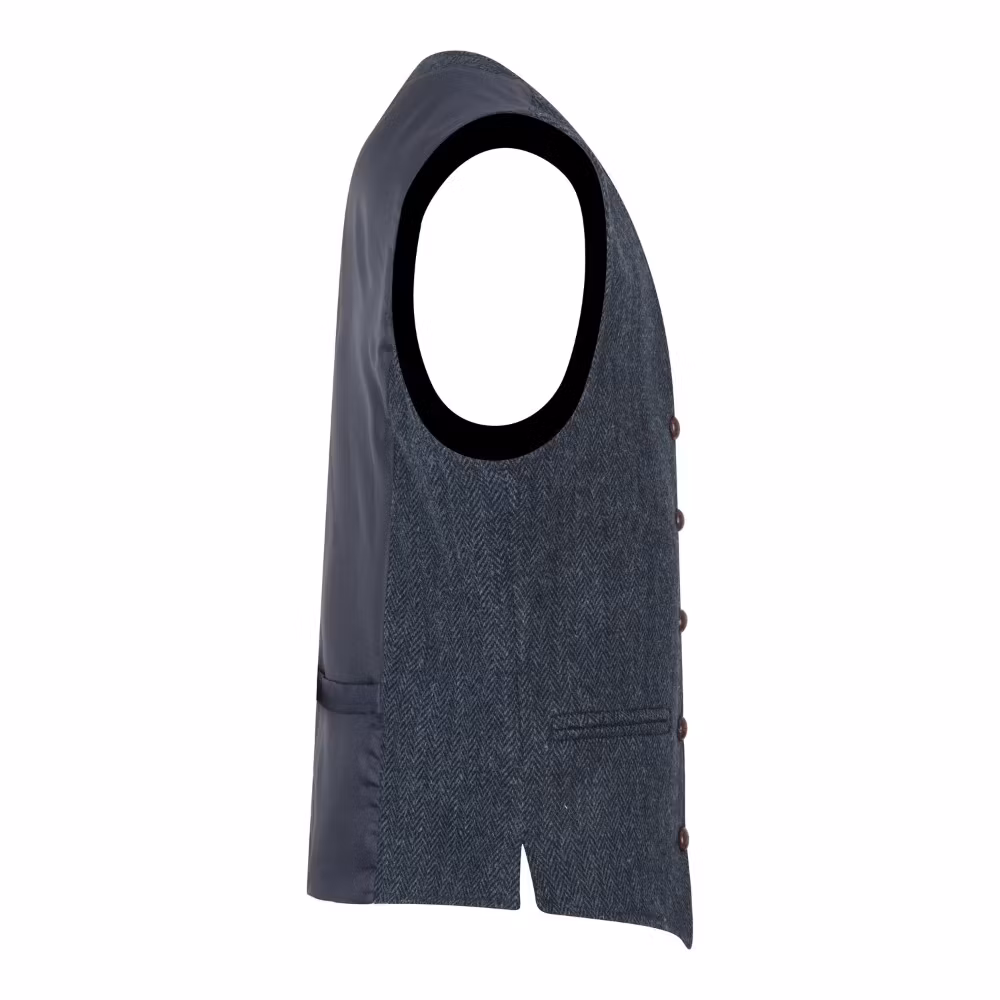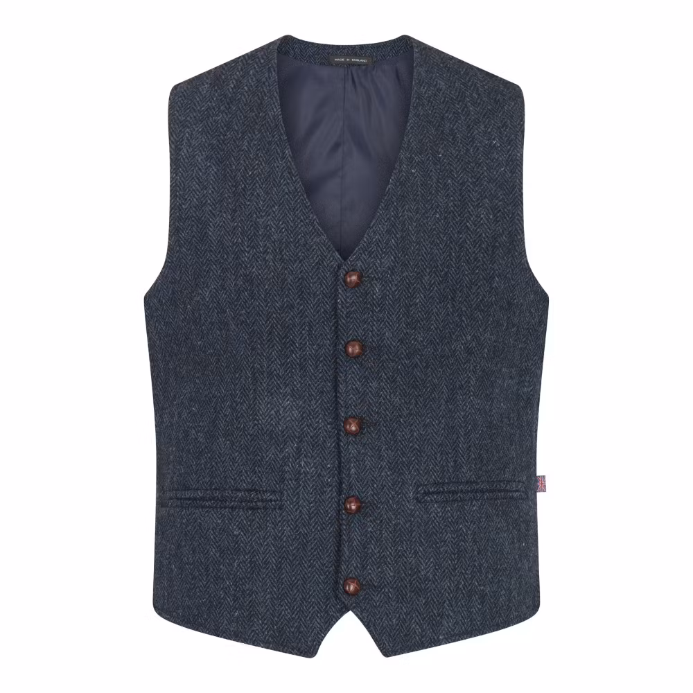En Harris Tweed väst I högsta kvalitet. Klassisk blå färg som passar till både finbyxor och jeans. Läderknappar och justerbar i ryggen med spännet.