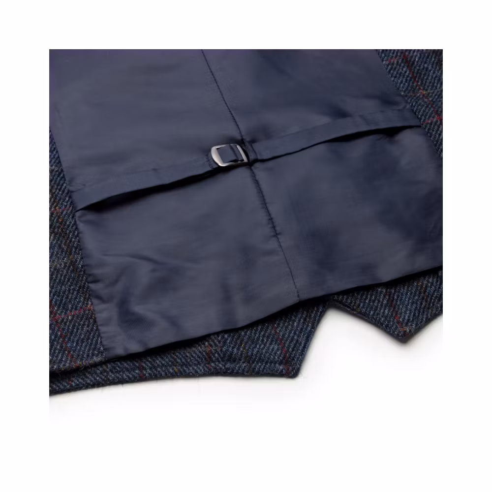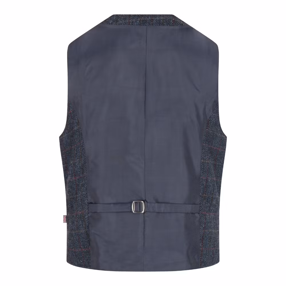 En Harris Tweed väst I högsta kvalitet. Klassisk blå färg som passar till både finbyxor och jeans. Läderknappar och justerbar i ryggen med spännet.