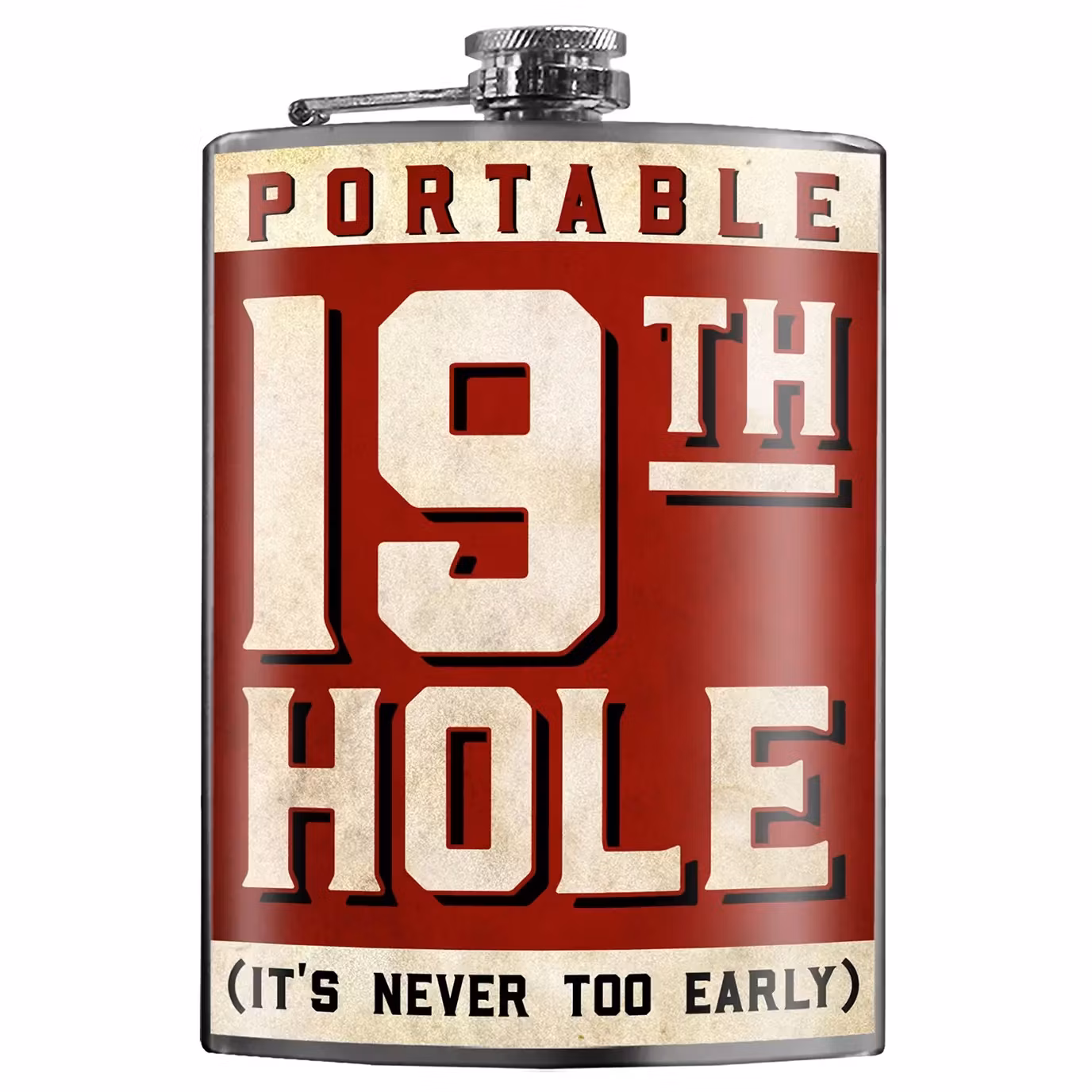 19th Hole - originalkonst på en fickplunta av rostfritt stål; skapad av artisterna Trixie & Milo - hur coolt är inte det?