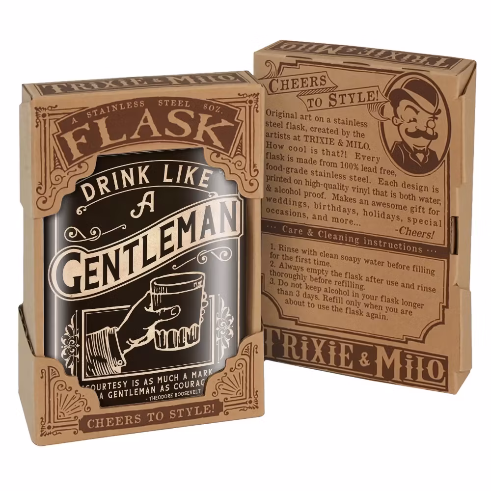 Drink Like a Gentleman - originalkonst på en fickplunta av rostfritt stål; skapad av artisterna Trixie & Milo - hur coolt är inte det?
