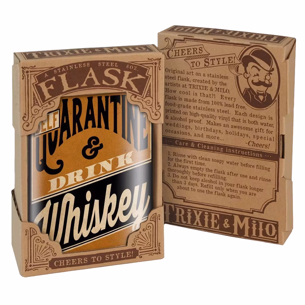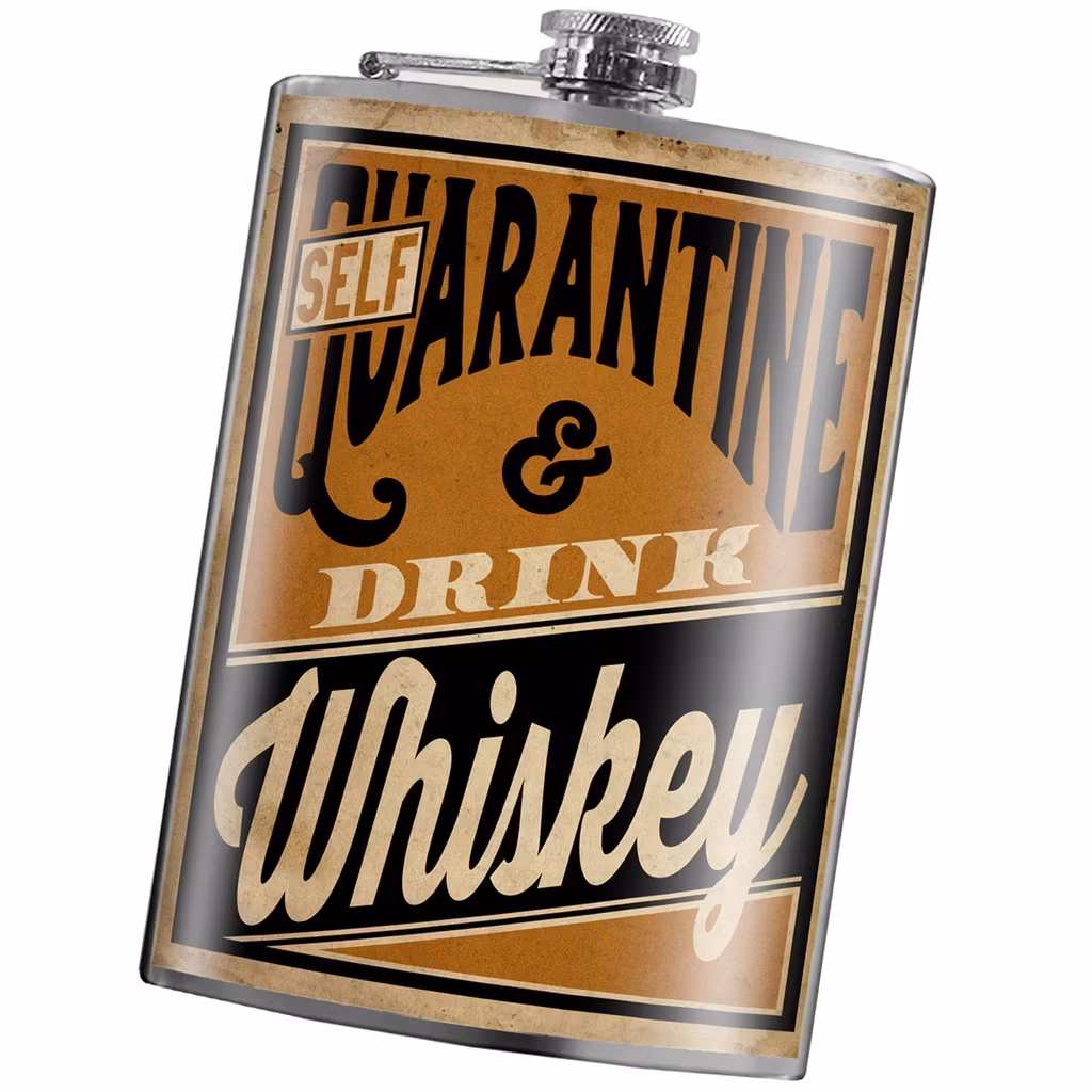 Self Quarantine & Drink Whisky - originalkonst på en fickplunta av rostfritt stål; skapad av artisterna Trixie & Milo - hur coolt är inte det?