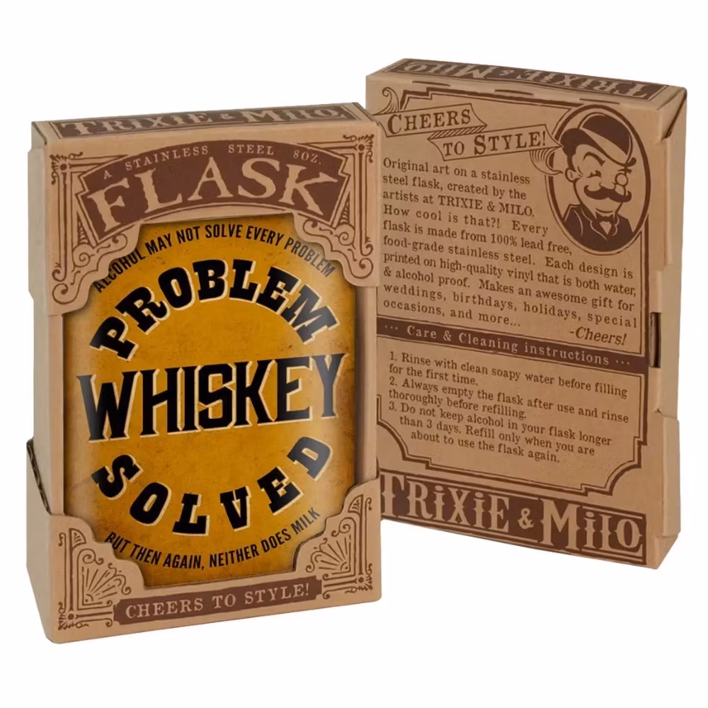 Problem Whiskey Solved - originalkonst på en fickplunta av rostfritt stål; skapad av artisterna Trixie & Milo - hur coolt är inte det?
