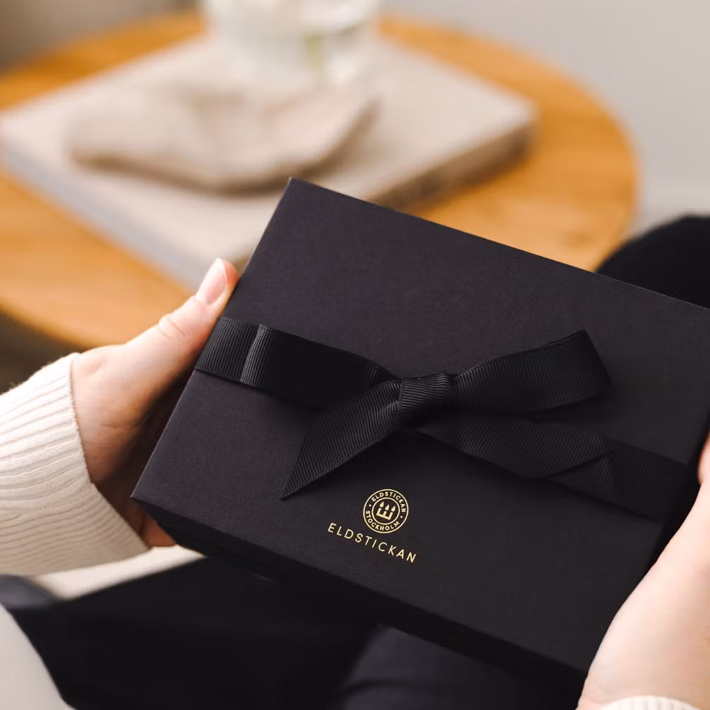 Presentboxen Klassisk innehåller tre lilla Eldstickan i färgerna Vit, Aska och Svart. Den vita färgen har blivit ett signum för skandinavisk minimalism och är en stilsäker klassiker som alltid känns rätt. Aska är en trendig och lyxig grå nyans, snygg att matcha med bland annat mässingsdetaljer. Den svarta färgen är klassisk, elegant och självsäker. Den går att matcha med alla andra färger och har därför blivit en av Eldstickans absolut bäst säljande kulörer.