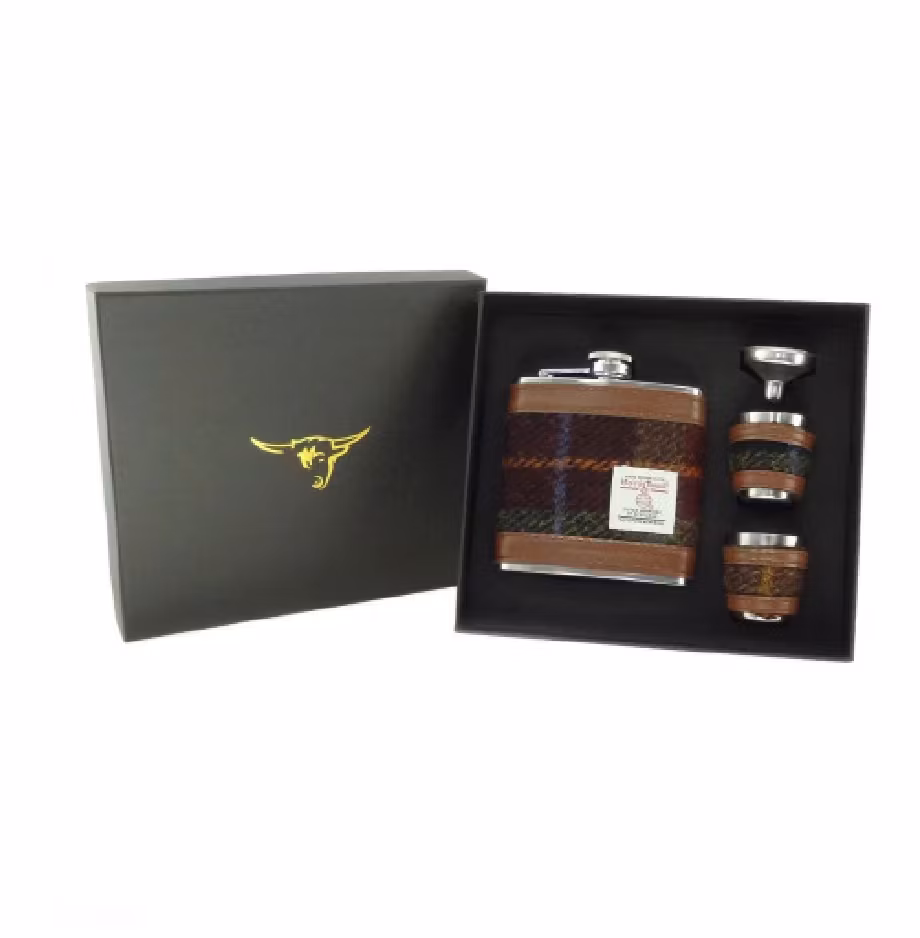En elegant Harris Tweed Rust Check fickplunta med två behändiga muggar och tratt, som rymmer ca 18 cl. Levereras i snygg presentkartong.