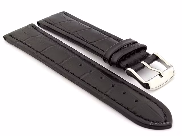 Ett svart klockarmband i läder med silverfärgat spänne. Ju mer klockremmen används ju snyggare och mjukare blir den.