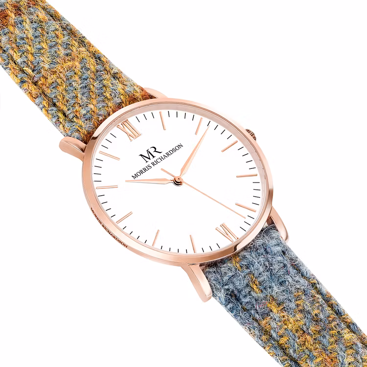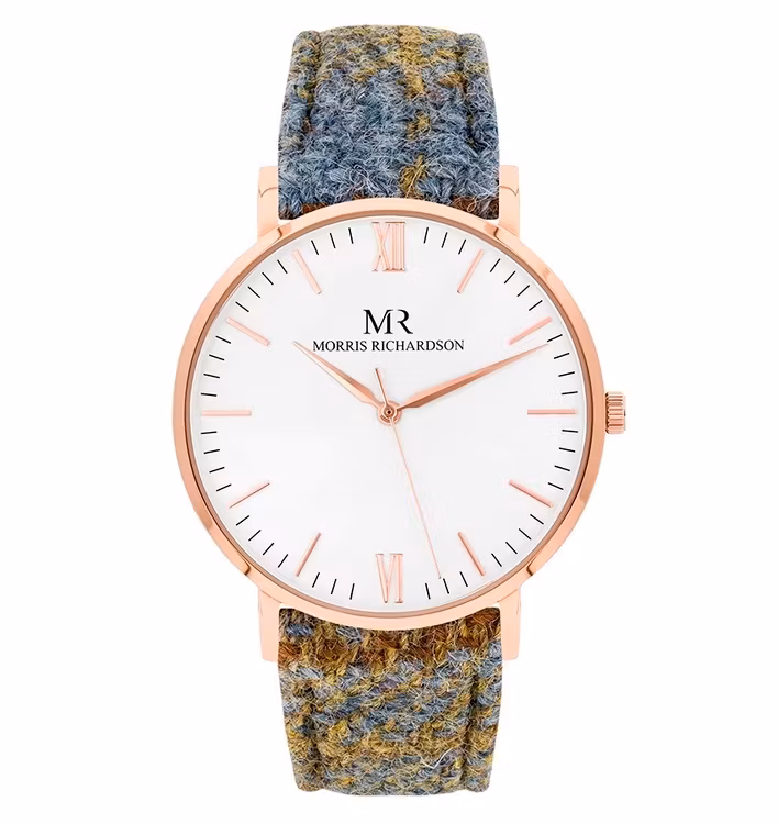 Highclere har en grön/blå äkta Harris Tweed rem med mjukt läder på undersidan. Exklusiv kvalitet garanteras med Highclere, som kombinerar ett schweizisk urverk, reptålig safirkristallglas och en kvalitetsboett i rostfritt stål.