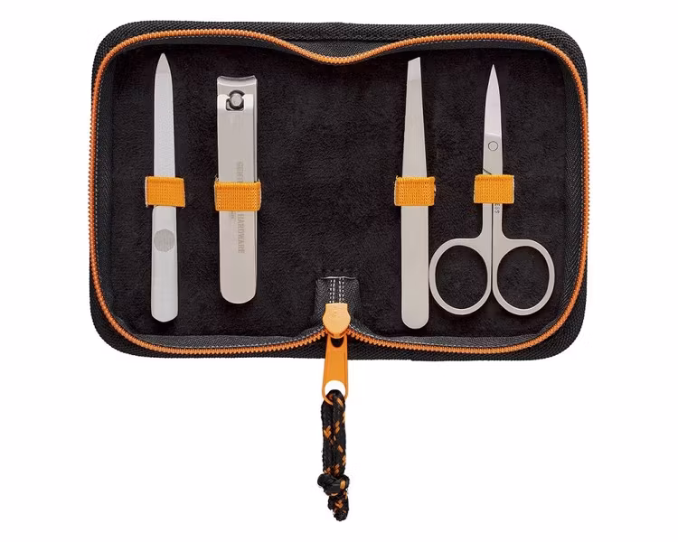 Fyra verktyg i ett fint fodral av slitstark polyester som hålls stängd med dragkedja.