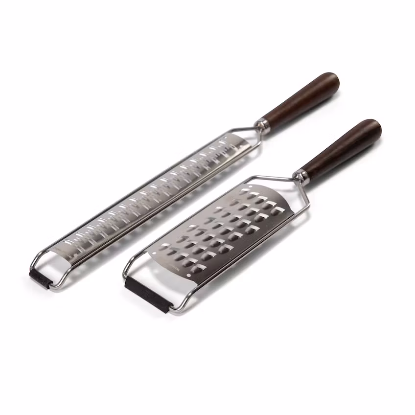 Rivjärn från Orrefors Jernverk som kompletterar varandra i matlagningen eller för att ha framme vid middagen. Gummilisten längst fram lutas mot underlaget och gör hyvlingen säker.
