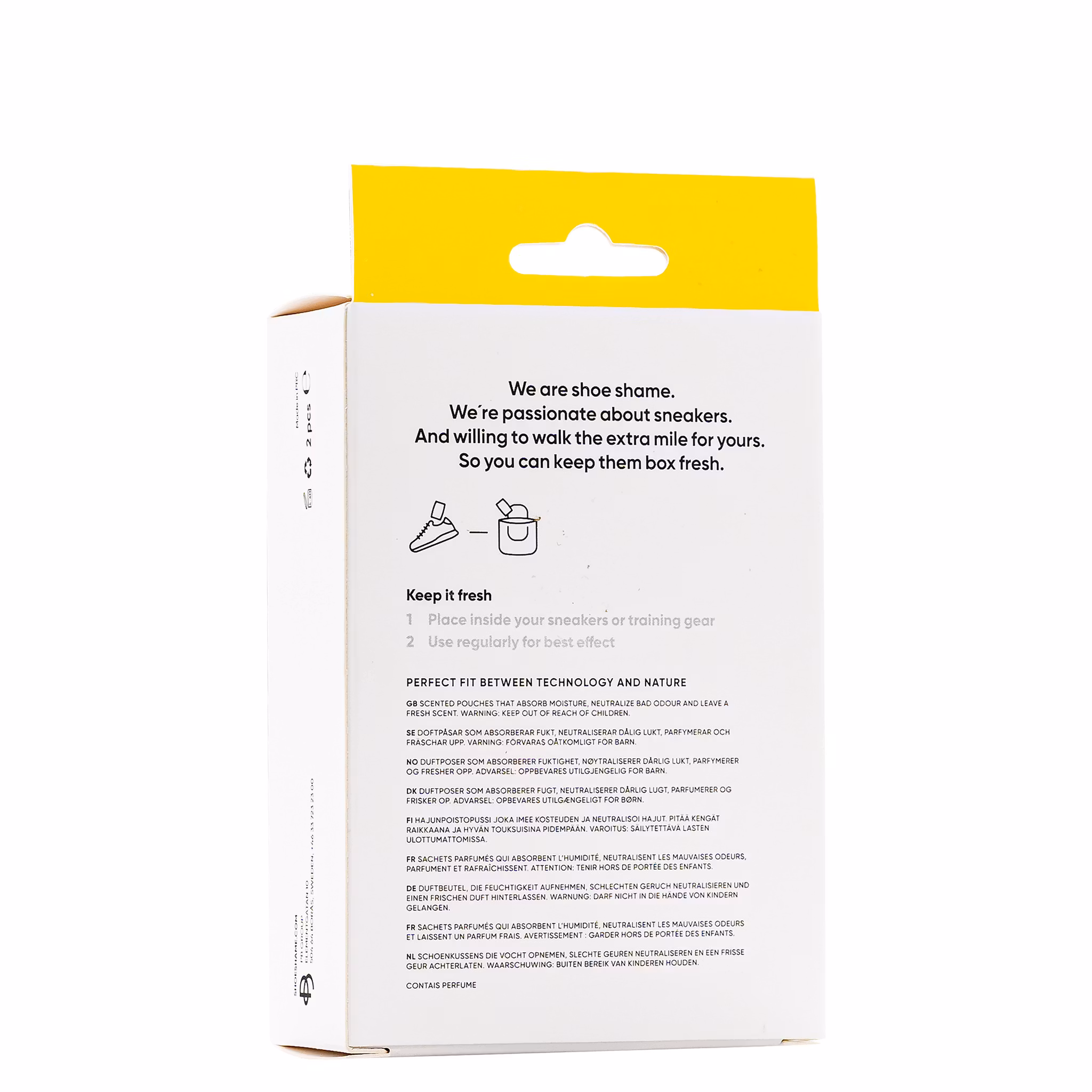 Doftpåse för skor, väskor och textilier. Absorberar fukt och neutraliserar lukt effektivt. Naturliga ingredienser som inte är skadliga för miljön. Lämnar en mild doft som avtar succesivt efter öppnade förpackning.