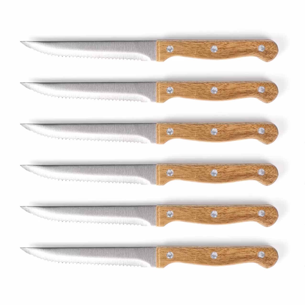 Förvaringsblock i akaciaträ med 6 stekknivar med tandade blad i rostfritt stål.