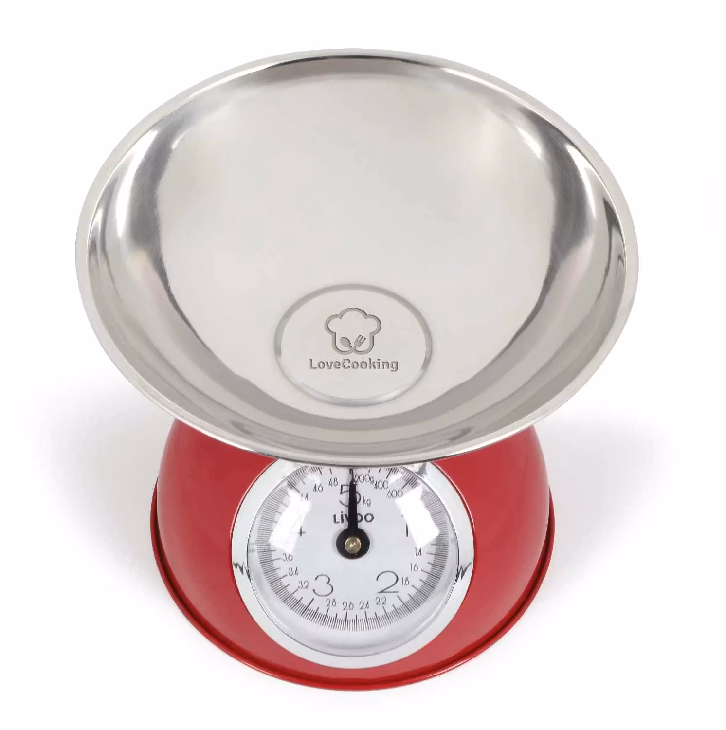 Röd köksvåg från Livoo med med en 1,8L skål i rostfritt stål med en noggrannhet på 20gr.