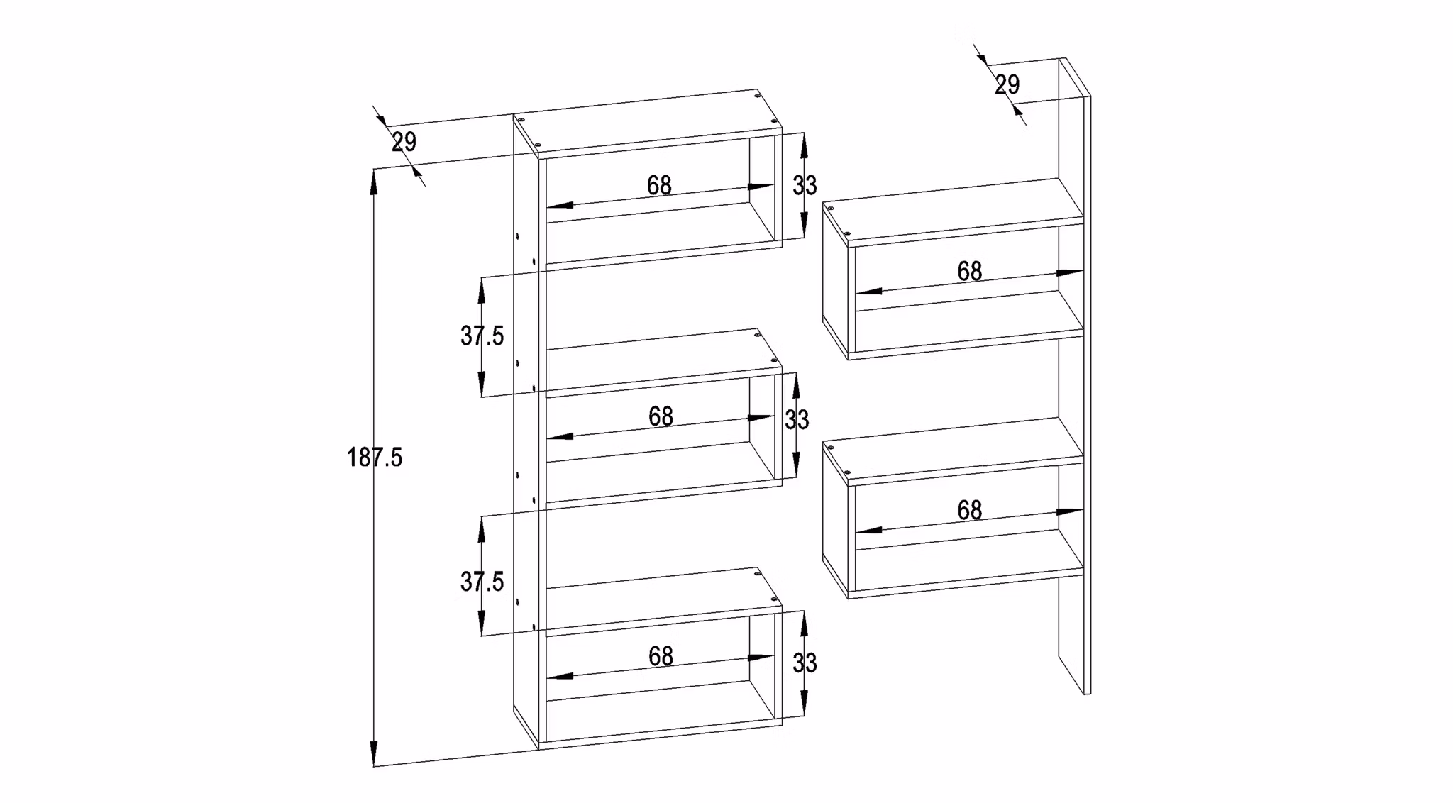 Höjd: 187,5 cm, bredd: 74 – 130 cm, djup: 29 cm.