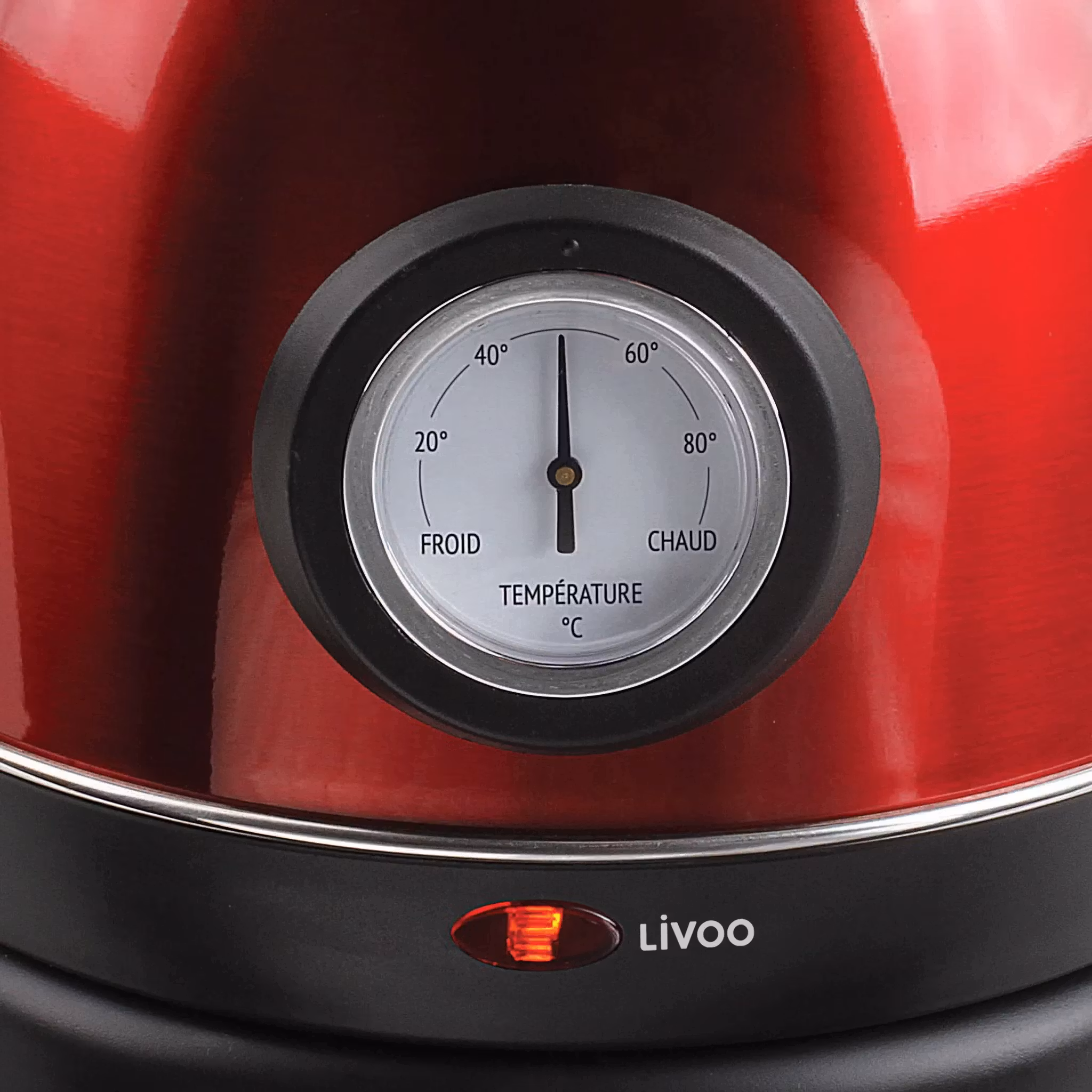 Röd vattenkokare i retrostil från Livoo med integrerad termometer. Kapacitet 1,8 liter.