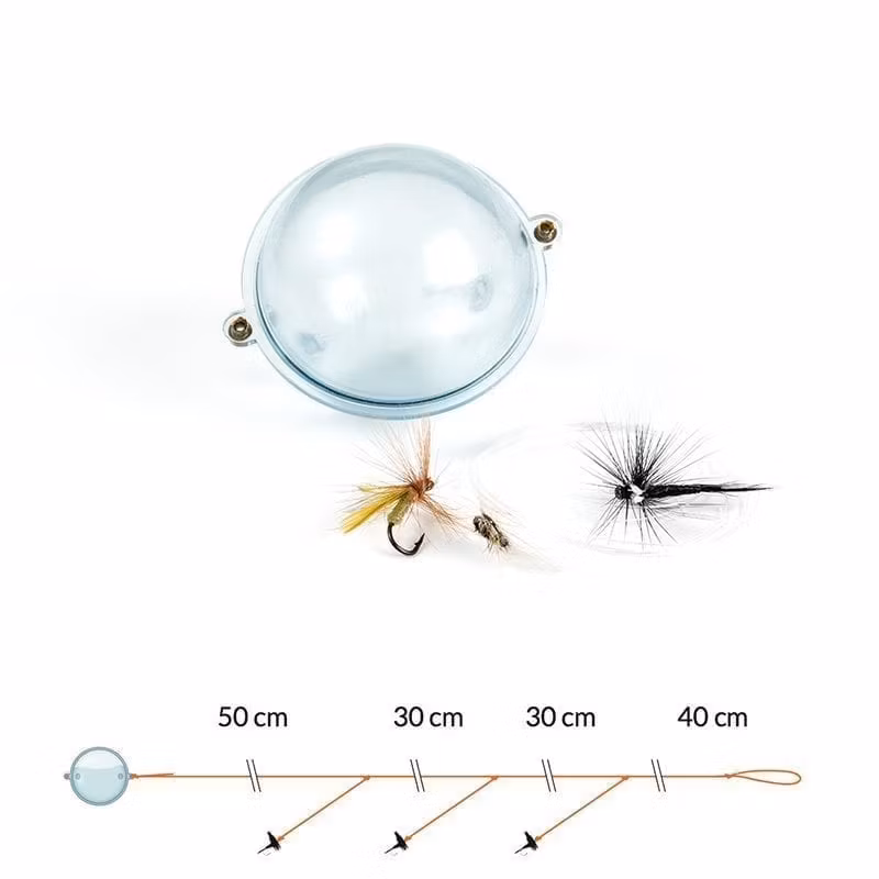 Komplett tackel med tre flugor för fiske med ditt vanliga fiskespö. Fyllplastkulan med vatten. Ju mer du fyller ju tyngre blir den.