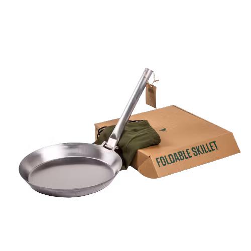 Med en hopfällbar stekpanna från Orrefors Hunting kan du laga mat till hela familjen runt lägerelden. Pannan är tillverkad i rostfritt stål och har ett ihåligt handtag i vilket du kan sticka in en pinne som förlängning om det börjar brännas om händerna. Levereras med snygg canvaspåse för förvaring samt presentförpackning.