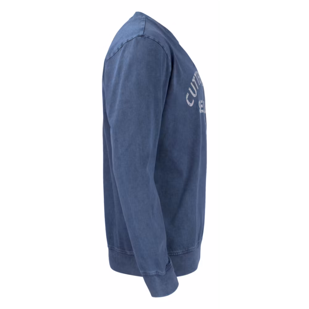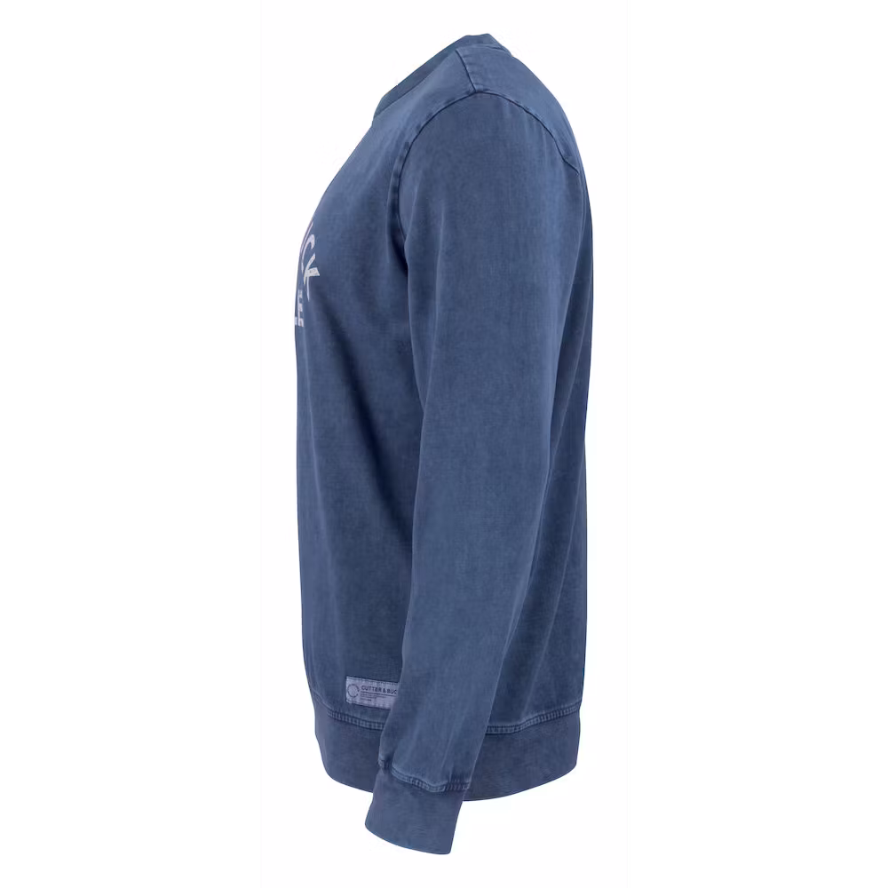 En bekväm och skön indigofärgad rundhalsad tröja från Cutter & Buck. Tryckt logga framtill. Plagget har tvättats för att uppnå en extra mjuk känsla. Ribbat avslut nedtill och på ärmen, hooden har detaljer med 3-nåls sömmar.Öko-tex certifierad.